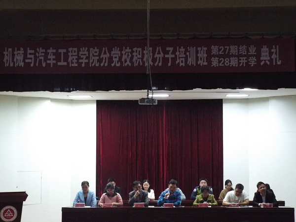 近日,机械与汽车工程学院分党校在学术报告厅举行第27期入党积极分子培训班结业暨第28期入党积极分子培训班开班典礼。院党委书记、院分党校校长邓英扣,院党委副书记周怡,全体辅导员以及两期培训班全体学员出席了本次典礼。典礼由院党委委员、团委书记黄炜主持。