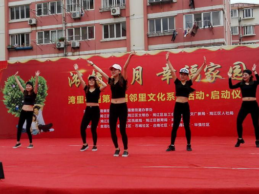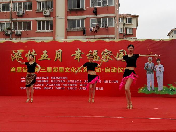 5月13日上午,在鸠江区湾里街道第三届邻里文化节的开幕式上,来自我校体育学院艺术团的青年志愿者们,以一段激情时尚的《歌舞串烧》博得了台下观众的热情欢呼。同学们青春靓丽的身姿,时尚优美的舞步,忘我投入的表演,再配以劲爆欢快的音乐,在展示舞蹈魅力的同时,也将青春和活力带给社区。
