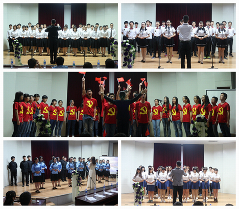 在极具感染力的《五四青年》朗诵声中,比赛拉开了序幕。13支队伍依次上场,他们或豪情万丈,或青春奔放,一次次将学报的氛围推向高潮,也深深震撼了评委和观众心灵。《众人划桨拉大船》,配合着“五四青年”的装饰,让人想起近百年前学生青年们对国家的责任、使命与热爱;《光荣啊!中国共青团》,浑厚有力的歌声,就像将士们的凯歌,让我们看到了青年团员高举团旗跟党走的信念;《红旗飘飘》,挥舞的五星红旗、激情飞扬的朗诵、温和的曲调,无不让人感受着学生对祖国的热爱。《国家》、《我的祖国》、《超越梦想》……一首首脍炙人口的红色歌曲唱响了时代主旋律;同学们饱满的热情、嘹亮的歌声、整齐的着装、朝气蓬勃的精神面貌给评委和观众留下了深刻印象。