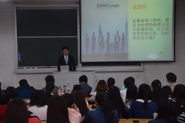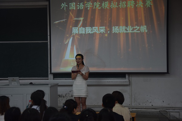 5月13日下午,外国语学院2016年双语模拟招聘大赛决赛在2J206成功举行。校人事处王中江,机械与汽车工程学院黄炜,学生处就业指导中心李恒奎和纺织服装学院毕亚琴应邀担任评委。院党委副书记谈丽华,团委书记余本祺,大三辅导员及全体学生到场观看了比赛。
