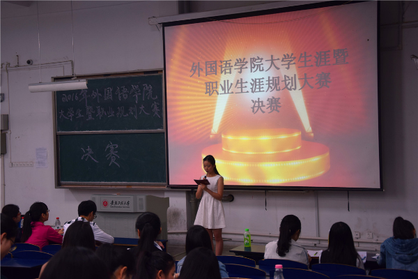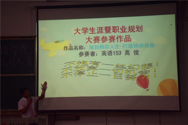 5月16日晚,外国语学院“大学生涯暨职业生涯规划大赛”决赛于六教214举行,大一助教及往届比赛获奖选手担任评委,英语153班的俞淳同学担任主持,辅导员王钰及15届全体同学共同观看此次比赛。