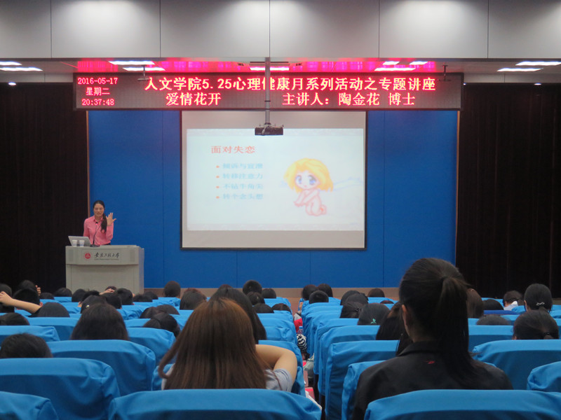 为了积极落实心理健康月系列活动,帮助同学们树立正确的爱情观,人文学院于5月17日晚七点在5教117举办了主题为“爱情花开”的专题讲座。讲座邀请到安徽师范大学心理健康教育中心主任陶金花为同学们开展讲座,院党委副书记金艾裙教授主持讲座,部分大一和大二学生聆听讲座。