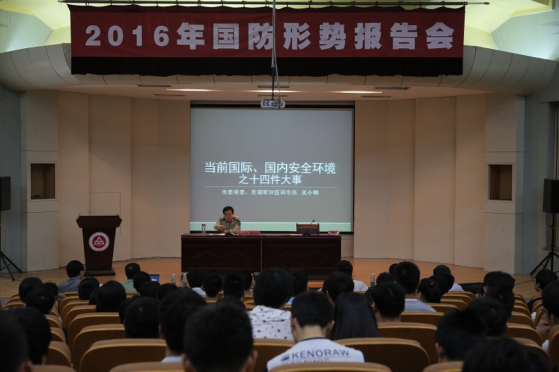 5月25日下午,芜湖市委常委、芜湖军分区司令员吴小明在学校学术报告厅做国防形势报告会,校党委常委、副校长郭兴众出席,校武装部和学生处有关人员、部分学院党委副书记及学生代表约300人聆听了报告。报告会由校武装部和学生处联合主办,由校办公室主任王弘主持。