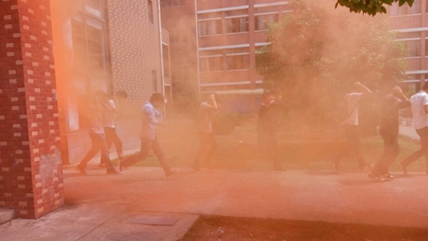 章靖平首先结合学生中发生的现实案例,如因疏忽大意寝室丢失电脑、操场丢失书包、酗酒死亡、水塘游泳溺死、寝室违规使用电器发生火灾、骑电动车过快撞人或被撞等,提醒同学们提高安全意识,保管好财物,关爱互助,珍惜生命。随后,葛伟阳对演练内容、具体流程以及演练要领进行了详细介绍,并带领大家学习了防震知识,熟悉应急避险的正确方法。特别要求同学们在演习中要保持镇定,听从指挥,服从安排。随后保卫处老师现场施放烟雾弹,模拟营造真实疏散场景,同学们按照事先安排的疏散顺序,在下楼时捂住口鼻,双手抱住头部,迅速、有序地疏散到教学楼外指定地点集合,之后由工作人员清点人数。1分37秒内,全员撤离危险地带,完成此次演练。