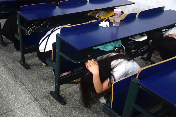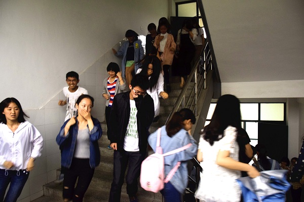 4点50分,模拟演练正式开始,同学们听到“地震”信号后,按照要求立即躲到课桌下进行避险。30秒后听到喊话:“现在地震暂停,发现火情,立即疏散”,同学们迅速从教室跑出,在疏散的过程中,同学们双手交叉护着头颈,沉着冷静、互相提醒、不推不挤按照预定的疏散路线有序撤离。到达楼下空旷处后,辅导员及时清点了人数,全部同学安全撤离。从警报响起到宣布地震演练结束,整个演练用时仅1分58秒。