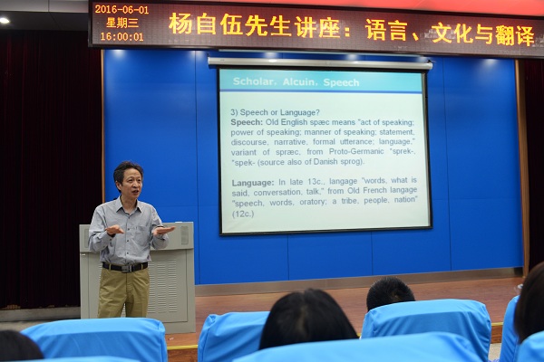 近日,著名学者、翻译家杨自伍应外国语学院邀请在五号教学楼117教室做了一场题为“语言、文化与翻译”的专题讲座。外国语院院长刘进教授、副院长黄焰结教授、全体外语教师、研究生以及来自本院和其他学院的本科生共计两百余人聆听了本场讲座。