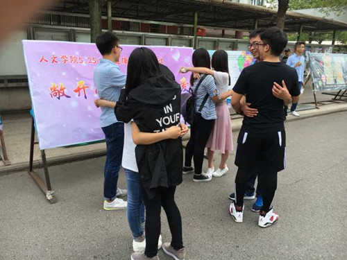 活动初期时,由于许多人较为害羞,所以所邀请的同学大多为女生且双方是朋友,爱的拥抱给予的仅仅是感谢与关怀;中期的时候,邀请到了男生们和其他情侣,虽然展现的是不同的爱的形式,但使我们的5.25变得更加精彩;最后我们工作人员尝试邀请陌生人,让他们之间进行爱的拥抱,短暂的时间里拉近的是两个人的距离,增加的别样的温暖与感动。