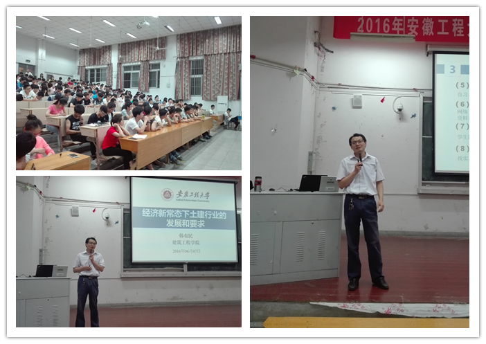 为加深同学们对土建专业的了解,更好的规划自己的大学生涯,6月7日晚,建筑工程学院邀请中国矿业大学韩有民博士在2教报告厅做题为“经济新常态下土建行业的发展和要求”的学术报告。辅导员承梓惠、黄贤君以及2015级全体学生参加了本次报告会。
