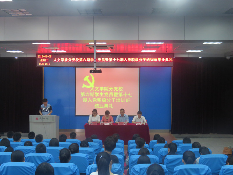 近日,人文学院分党校第六期学生党员暨第十七期入党积极分子培训班结业典礼在5教117举行。院党委书记伊长文、副书记金艾裙、团委书记黄江胜参加了结业典礼,典礼由第十七期入党积极分子培训班班主任谢红翠主持。