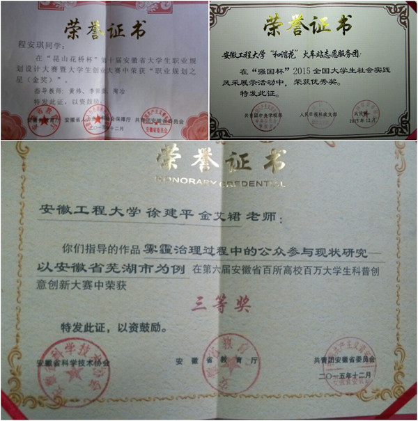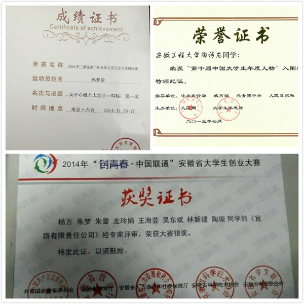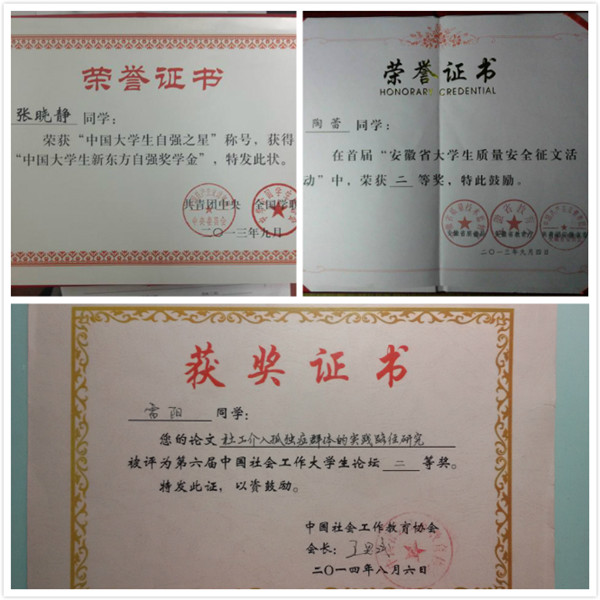 创新人才培养模式,着力提高学生的创新意识和实践能力,是高校本科教育教学工作的重点要求。人文学院积极创造条件,支持和鼓励高年级同学在掌握一定专业知识的基础上,参加各级各类竞赛活动,取得了一定的成绩。如行管101张晓静同学获得团中央2013年中国大学生自强之星称号;社工112杨方等获得省教育厅2014年“创青春·中国联通”安徽省大学生创业大赛银奖;社工111班雷阳同学在2014年全国社会工作大学生论坛中获得二等奖;“和谐花”火车站志愿服务团获得团中央学校部2015年“强国杯”社会实践优秀奖;法学131班孙梦捷同学荣获2015年“全国空手道俱乐部争霸赛”冠军;社工131班程安琪同学2015年获得第十届安徽省大学生职业规划设计大赛暨大学生创业大赛金奖;社工132班丁汪敏同学2015年在第六届安徽省百所高校百万大学生科普创意创新大赛中获得三等奖;等等。学生主动参与多项高水平学生竞赛,既促进了学科知识的应用、交叉与融合,又有助于培养学生团队协作精神,促进大学生综合素质的全面提高。