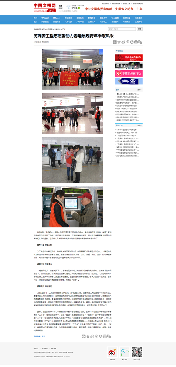2016年春节期间我校“暖途”青年志愿者服务社积极响应校团委和人文学院团委开展志愿服务“暖冬行动”的号召,组织24名志愿者在芜湖市火车站开展了为期15天的春运志愿服务活动。为对“小甜橙”们的工作表示积极的肯定,6月25日,全国铁道团委对全国春运志愿服务活动中表现突出的志愿组织予以表彰奖励,我校“暖途”青年志愿者服务社被全国铁道团委授予了“2016年铁路春运青年志愿者优秀组织”的荣誉称号,同时,以陈宇为代表的8名志愿者获得了全国铁道团委、全国铁路青年志愿者协会所共同颁发的“青年志愿者优秀个人”的荣誉称号。
