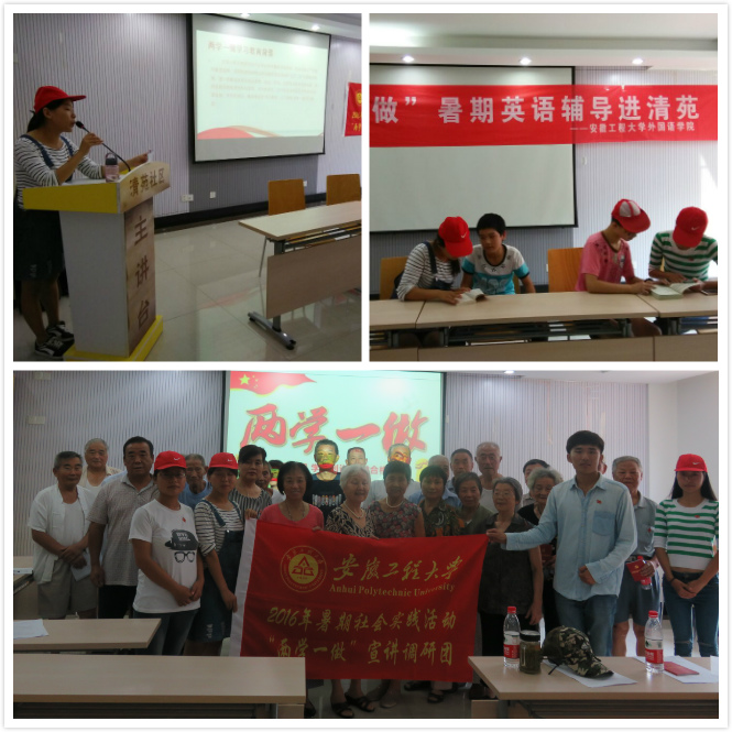 8月16日,“两学一做”宣讲团赴芜湖市清水清苑社区开展活动。在社区工作人员的大力支持下,团队成员向社区的的100多位党员同志进行“两学一做”宣讲活动;同时,依据前期编制的问卷,深入社区居民家开展调研活动。下午,在社区提供的场所内,成员们发挥专业特长,给社区孩子进行英语辅导。后期,该团队将继续前往安庆、宣城和萧县等地开展宣讲活动。