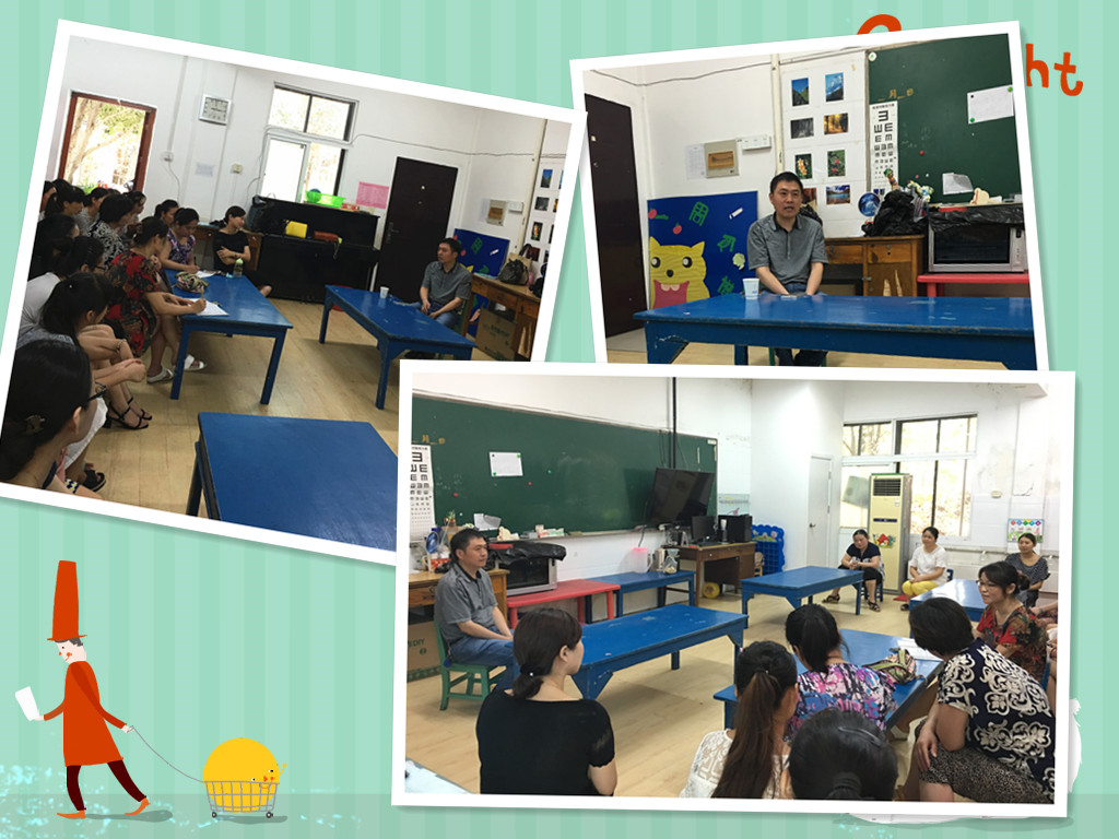 上午8:30,胡长新在中(2)班教室给全体教职工开了一次新学期动员大会暨工作布置会议。胡长新从幼儿园工作的性质、特点和重要性,谈到职业与事业的区别、付出与收获的关系、终身学习的理念以及马斯洛的需求理论等,深入浅出地给幼儿园全体教职工上了一堂生动的思想理论课。