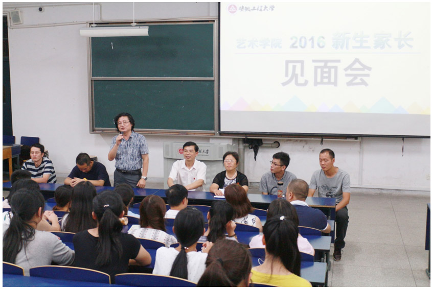 为欢迎新同学及家长的到来,为他们解惑答疑,9月1号晚,艺术学院在6教215教室召开2016级新生家长见面会。院党委书记刘金斌、院长黄凯、院党委副书记孟向红、副院长张学东、副院长承杰、动画系主任史启新、视觉传达教研室主任顾梅、工艺美术教研室主任姚明奇、广告学教研室费利君及新生辅导员参加了此次家长见面会。见面会由院团委书记迟传德主持。