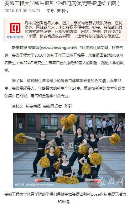 9月6日的安徽网以《RayBetApp官网下载 新生报到学姐们展优美舞姿迎接》为题,从迎新学姐、志愿者、后勤工作人员等多个层面,用图片新闻的形式全方位展示了我校的迎新工作。