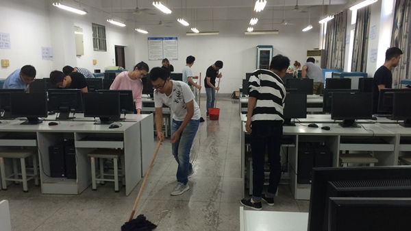 班主任周磊把学员们分成4组,分别对4个实验室进行清洁。每个小组负责人进行了明确的分工,女生负责桌面清洁,男生负责扫地拖地,还帮着给冲洗抹布的同学换水。虽然六楼几个实验室由于暑期房顶维修后显得有些脏乱,在学员们有条不紊的清扫和整理下,整个机房变得干净整洁,为前来机房上课的学生提供了更舒适的实验环境。