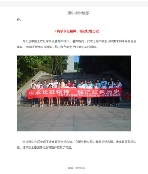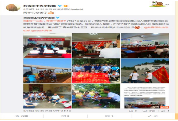 8月6日,共青团中央转发我校团委有关“暑期社会实践团队深入国家特困地区金寨县开展‘精准扶贫’调研观察实践活动”的微博并且评论“同学们辛苦了”,极大赞赏同学们的社会实践活动。