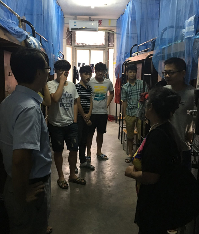 孟向红一行逐间走访新生寝室,亲切询问了新生的生源信息、家庭情况及刚到学校的感受,并就住宿条件、宿舍规定和入学后的生活适应性等相关生活学习问题,与学生进行深入的交谈,并听取了学生对学校的意见。孟向红勉励新生同学要尽快适应大学生活节奏,遇到问题和困难时要互帮互助,并及时与辅导员老师沟通,经常与家长保持联系。孟向红还叮嘱新生同学要注意自身安全和财产安全,夜晚尽量避免外出,注意安排好作息时间,努力学习,提高自身修养。