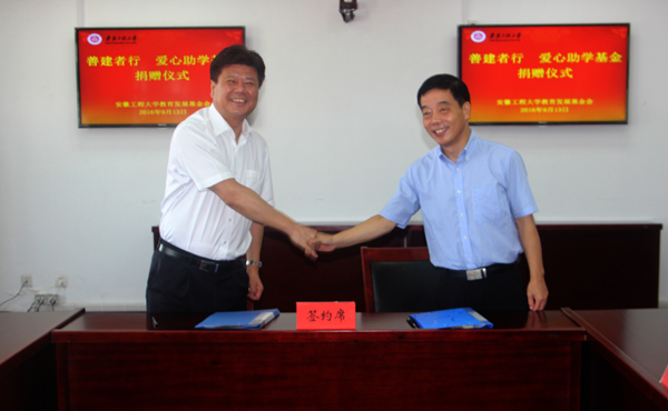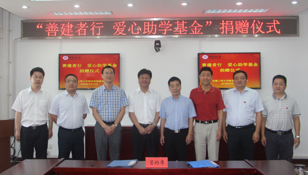9月13日上午9点,校长刘宁,有关部门负责人,基金会理事们热情接待了84届校友、中国建设银行芜湖分行行长、党委书记陈光华,副行长张培锋、葛晓农等一行,并在综合实验楼A座1121会议室举行了“善建者行 爱心助学基金”捐赠仪式。捐赠仪式由发展规划处处长、基金会副理事长兼秘书长曹安照主持。