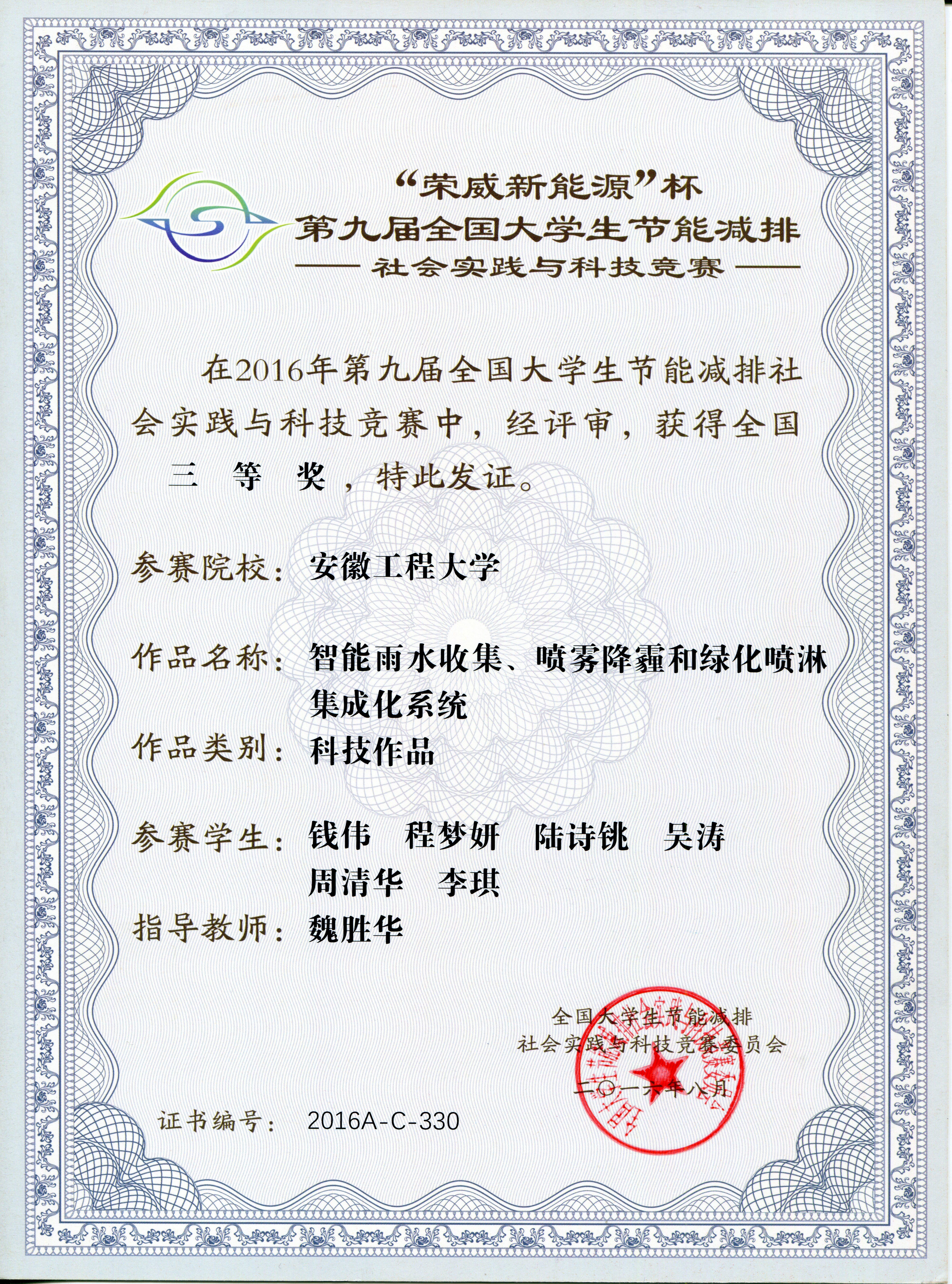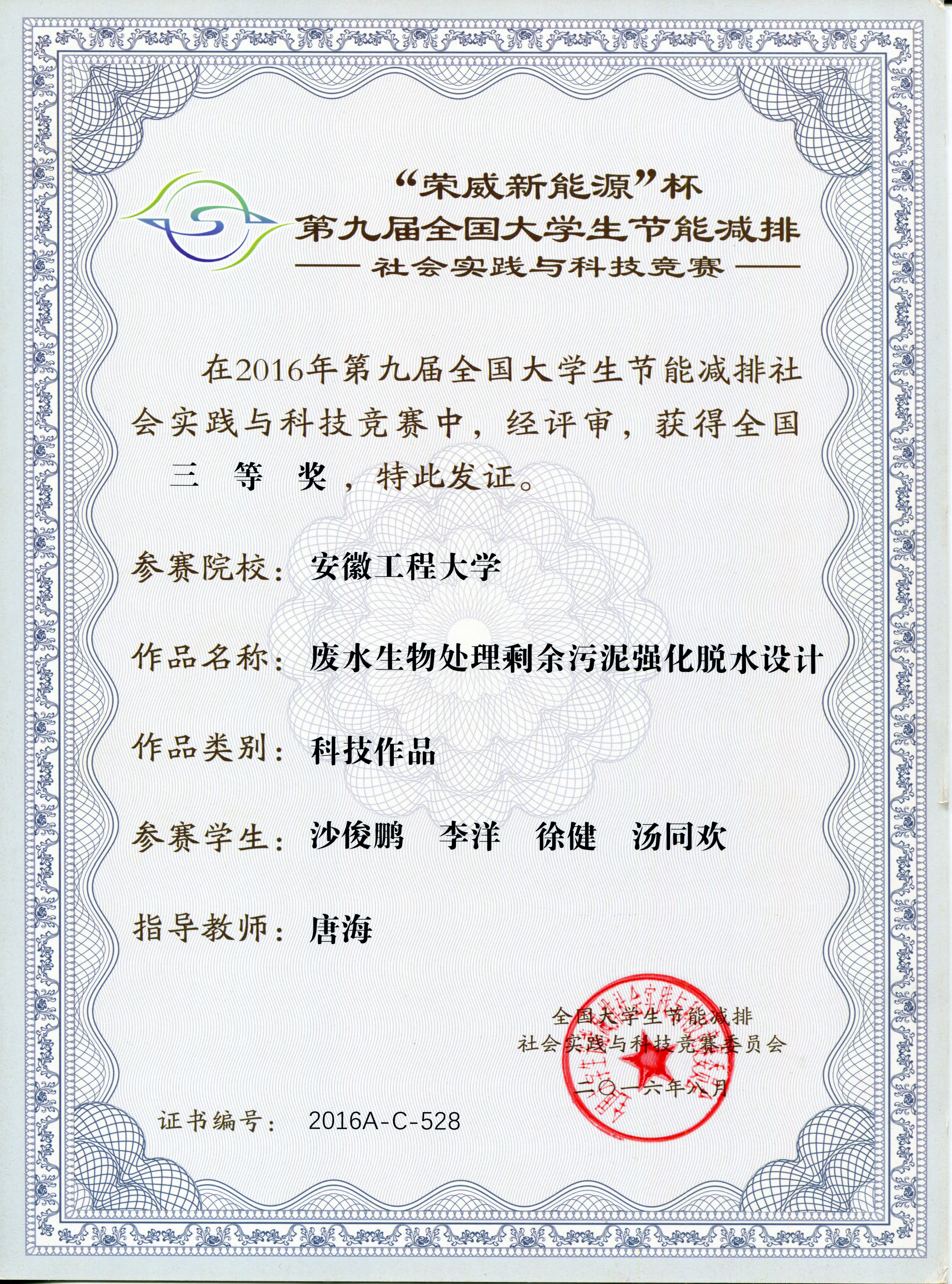 最终,生化学院魏胜华老师指导的《智能雨水收集、喷雾降霾和绿化喷淋集成化系统》和唐海老师指导的《废水生物处理剩余污泥强化脱水设计》两件作品荣获三等奖。