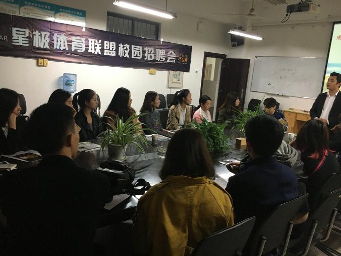 10月25日,体育学院2017届毕业生首场招聘会在学院会议室举行,星极体育联盟叶老师、体育学院团委书记王彦青、毕业班辅导员黄蓉静和数十名毕业生一起参加了招聘工作。