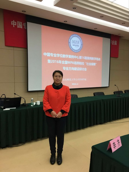 11月5日至6日,由教育部学位与研究生教育发展中心和全国公共管理专业学位研究生教育指导委员会联合举办,山东师范大学公共管理学院承办的中国专业学位教学案例中心第16期案例教学培训暨2016年全国MPA培养院校社会保障专业方向建设研讨会在山东师范大学召开。我校人文学院孙丽老师参加了此次研讨会。