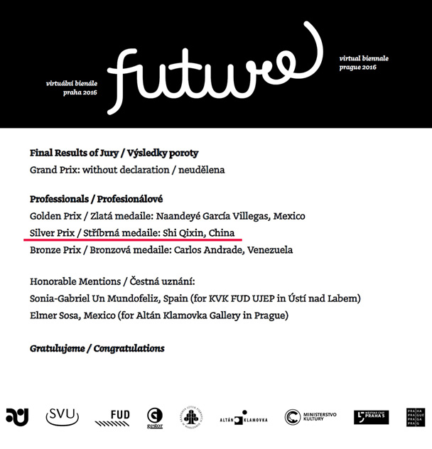 本届双年展主题是“未来”,由捷克图形应用协会、布拉格平面设计协会联合主办。参赛艺术家来自世界31个国家,共选出专业组金、银、铜奖各一名,优秀奖两名。史老师是专业组获奖者中唯一的中国艺术家。参加此次国际展的设计艺术家来自德国、法国、西班牙、波兰、捷克、意大利、美国、俄罗斯、墨西哥等设计强国,史启新的作品能够胜出,实属不易,反映了他优秀的设计水平。