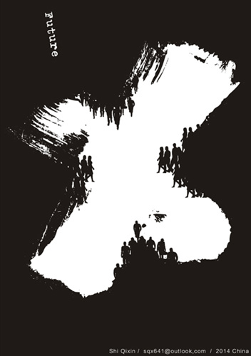 海报《future》中的“X”有未知、无限、否定等含义,揭示了急速增长,并过度向大城市集中的人口所导致的资源不足、文化趋同等社会问题,思考处于十字路口的人类社会的未来走向。