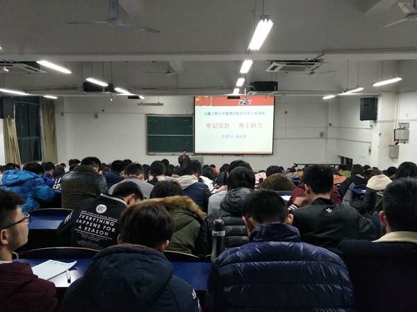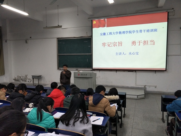 11月24日晚,数理学院党委副书记水心宝在五教217教室为学院学生骨干培训班学员作了《牢记宗旨勇于担当》的党课报告。数理学院分党校第21期入党积极分子培训班以及数理学院第一期团学骨干培训班学员聆听了报告。