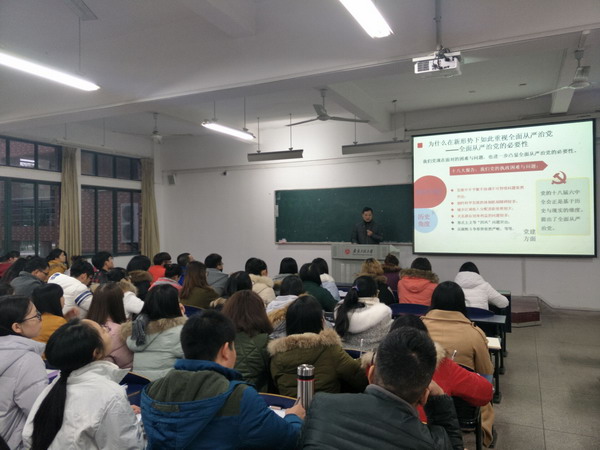 为了全面贯彻党的十八届六中全会精神,深入推进“两学一做”学习教育,11月25日下午,人文学院在六教112举办了学习贯彻党的十八届六中全会精神的专题讲座,党委书记邓英扣作主题报告,部分党支部书记、全体学生党员、院第十八期入党积极分子培训班的全体学员参加此次讲座。讲座由学院党委副书记金艾裙主持。