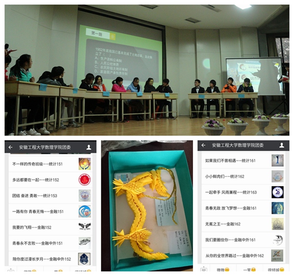 此次班级风采大赛由班徽设计、手工艺制作、班级风采展示和百科知识竞答四个环节组成。初赛以班徽设计的微信投票结果决定进入决赛的班级。在班徽设计中,各班级展开了奇思妙想,巧妙地将数字、水墨、数学原理等融入班徽,表达班级精神,展现班级形象;在微信投票中,同学们采用线上线下多种方式,邀请他人为班级点赞,最终大一、大二共七个班级进入决赛。手工艺制作环节,各班级上报的作品,创意新颖,制作精美。“龙卧浅滩”虽暂处困境却有飞天之势,“飞夺泸定桥”再现中国红军在艰险铁索之上的英勇,“红色之旅”是二万五千里长征的缩影更是中国红军艰苦奋斗的体现……一份份作品,一次次回忆,带我们回到那个四万万同胞英勇不屈的时代。