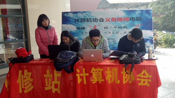 26日早上9点,虽然天气温度很低,但是维修人员早早地赶到活动地点,不一会儿就有同学前来咨询。志愿者首先根据咨询者在使用电脑过程中所遇到的问题进行诊断,对症下药,帮助故障并告诉他们使用过程中的注意事项。对于前来安装软件和系统的同学,工作人员也很有耐心的为他们装上了所需的软件。其实很多电脑故障多是由于大多数同学电脑使用经验不足,或对电脑没有进行基本有效的维护造成的。工作人员们不仅为他们解决了问题,还向他们介绍了一些在平时使用中可能遇见的小问题以及解决方案。