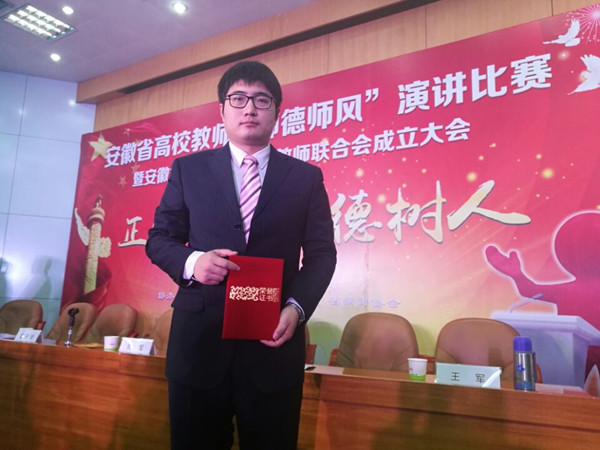 本次大赛设预赛、复赛和决赛三个环节,在各校预赛的基础上,来自合肥工业大学、安徽大学等全省79所高校预赛中脱颖而出的79名优秀教师选手参加了此轮复决赛。我校马克思主义学院青年教师尚子翔博士以“教师修养永在路上”为主题,由一张学生亲手制作送给他的精美贺卡,引出自己对师生关系的感悟,演讲声情并茂、抑扬顿挫、联系实际、主题鲜明,赢得了评委和观众的好评,经过激烈的角逐,荣获大赛一等奖。