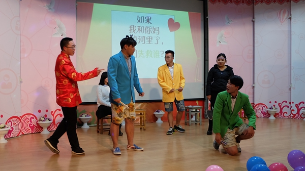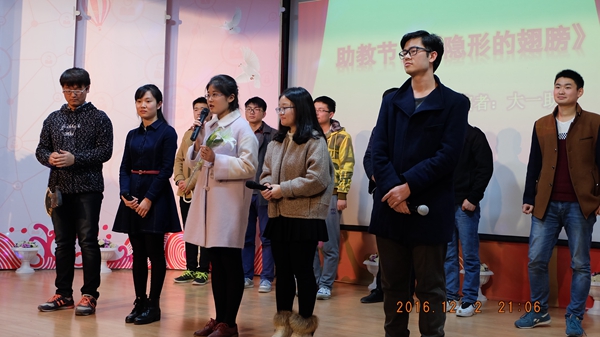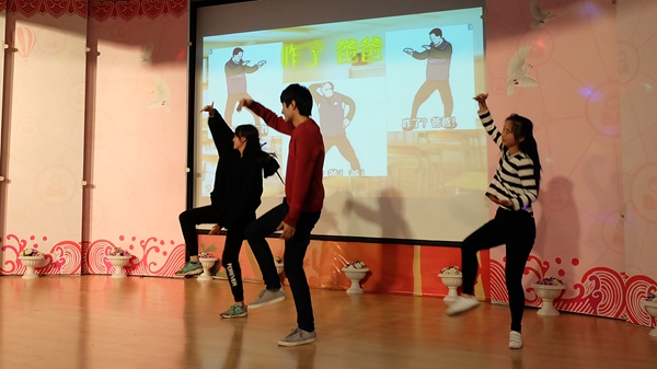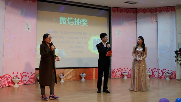 晚会的过程中,同学们不断用微信上墙和鼓掌的方式表达对表演者的赞赏,一条条温暖又诙谐的微信也给晚会带来不少乐趣。在中场活动中,微信抽奖与互动游戏环节观众们积极参与,大一辅导员罗国旗和苑雨露也参与其中,晚会气氛高涨。