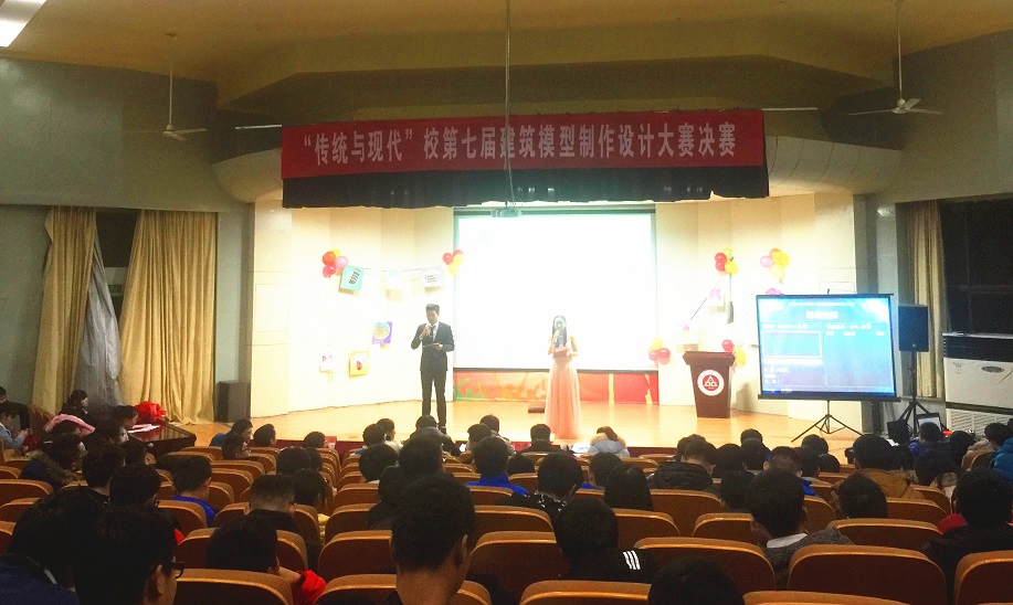 12月13日晚7时,以“传统与现代”为主题的校第七届建筑模型制作设计大赛决赛在学术报告厅隆重举行。建筑工程学院老师代表周华聪、付晓慧、李茜、梁楠和艺术学院吴劲松担任评委。学院领导、专业教师、团委书记和辅导员以及各学院学生会主席、实践部部长等到模型展示和答辩现场观看。