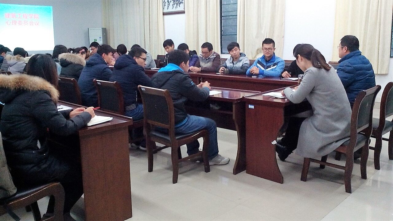 12月15日下午4:30,建筑工程学院在院会议室召开各班级心理委员会议。院团委书记刘海涛、辅导员赵恒芳以及各班心理委员参加了会议。会议就进一步做好学院大学生心理健康教育工作提出要求和想法,要求各班心理委员要高度重视班级心理健康工作,认识到具有健康积极的心态将有助于个人的健康成长,有助于学校的安全稳定,营造稳定、和谐的校园环境。