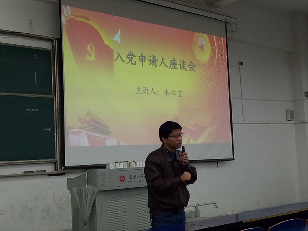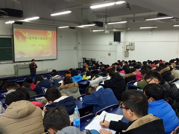 12月21日下午,数理学院在五教217教室开展入党申请人集体谈话活动,数理学院党委副书记水心宝,新生辅导员满志宏及大一申请入党150多名同学参加了活动。