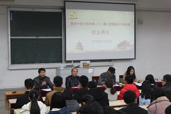 12月23日下午,数理学院分党校第二十一期入党积极分子培训班结业典礼在二教106举行。院党委书记周毅仁、院长费为银、党委副书记水心宝、院团委书记(学工秘书)郭亚勤和全体辅导员参加结业典礼。典礼由培训班班主任李悦主持。