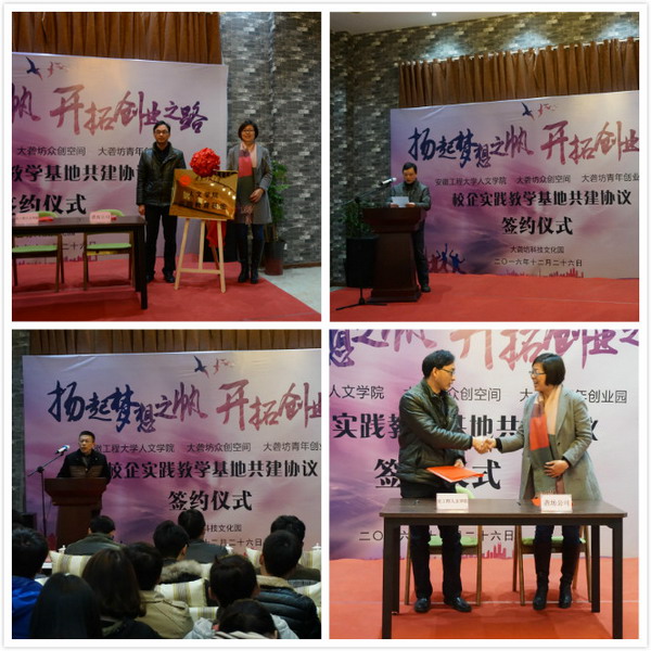 为进一步深化校企合作,探索校企协同育人的人才培养模式,强化专业人才培养与社会需求的对接,12月26日,我校人文学院与安徽大砻坊科技文化园共建实践教学基地签约暨揭牌仪式在安徽大砻坊科技文化园隆重举行。