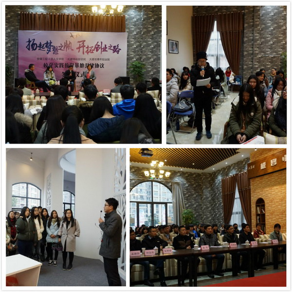 之后,在创业分享环节,芜湖金丝雀装饰设计有限公司总经理刘金涛,芜湖银丝雀软装设计有限公司总经理孟丽莎,分别介绍了自己在创业历程中的心得、体会与经验。并与同学们进行互动,回答了大家提出的问题,交流过程中气氛热烈而欢快。仪式结束后,在相关人员的带领下,同学们参观了黑云创意谷、筑梦工厂、众创空间等创业基地。