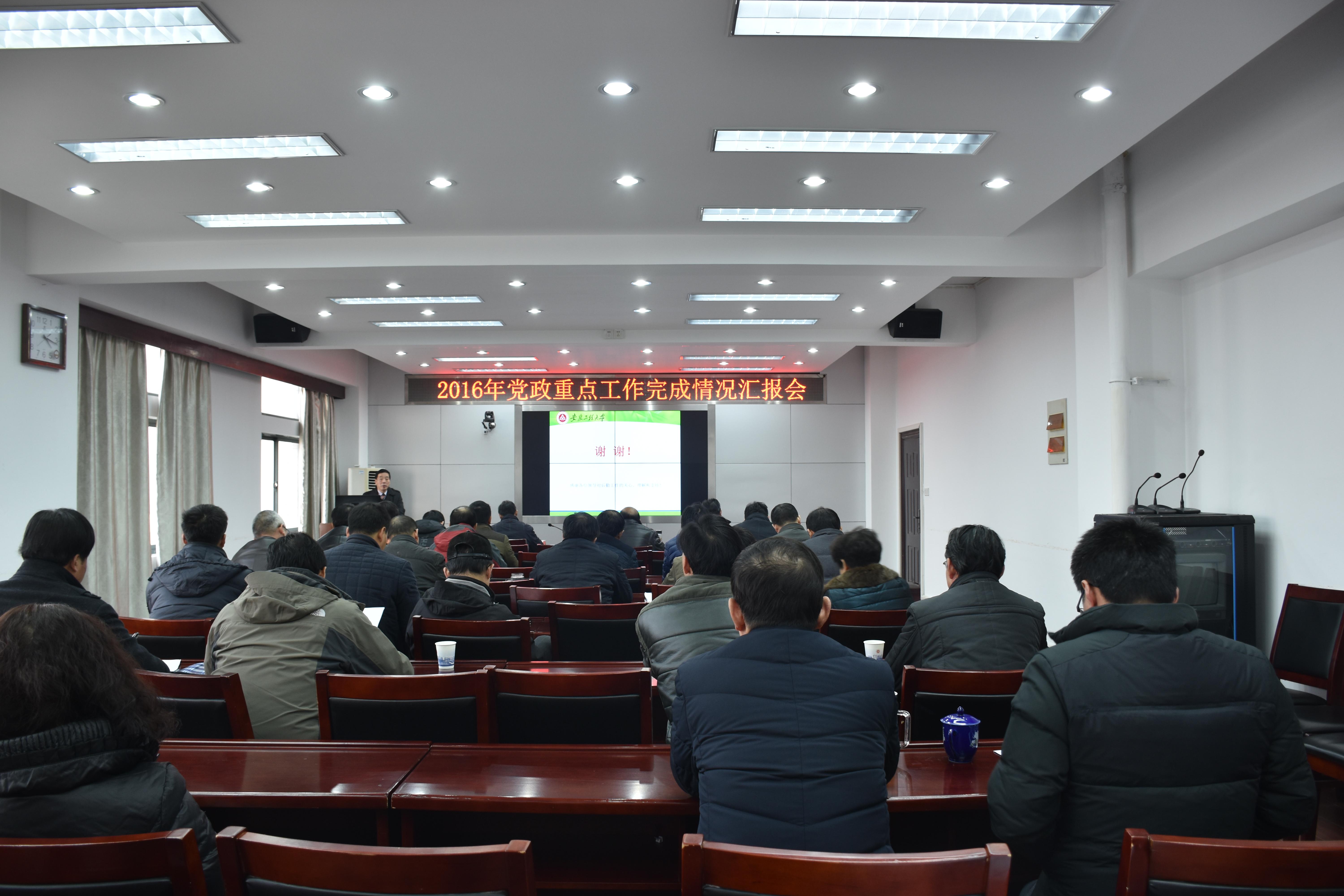 12月30日,学校召开2016年党政重点工作完成情况汇报会。校领导刘宁、叶常林、李震、苏国红、郭兴众,以及各学院党政主要负责人、各部门主要负责人,党代表及教代会执委会成员参加会议。