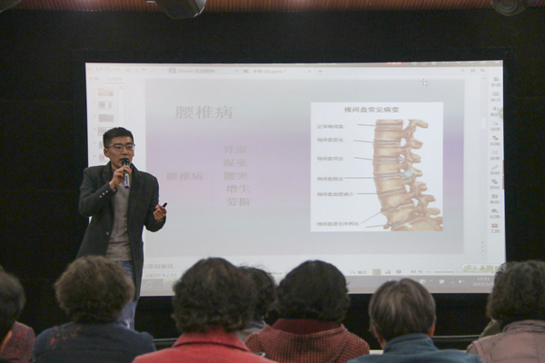 尹康老师结合丰富的临床经验和教师职业高发的颈椎、腰椎、关节和“三高”问题,深入浅出地介绍各类疾病的症状和成因,并着重讲解了广大教师最为关注未病亚健康的保养预防,他表示养生疗法效果显著,长期坚持以减少对药物的依赖,饮食上更应做到“少盐多醋、少车多路、少荤多素”;对于教工硬性疾病发病率上升的现状,他建议防患于未然,生活中多加注意,平时可采用“耸肩”法和锤敲穴位法按摩脊椎,以减少肌肉疲劳。