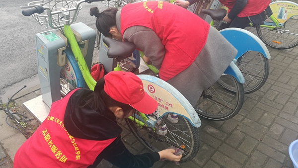 3月5日上午,计算机与信息学院志愿者团队来到学校东门,为门口的公共自行车做清洁工作。同学们弯下腰,低下头认真仔细的清洁这些公共自行车,使它们再次露出崭新的面貌,给城市容貌改善提供了一份力量。