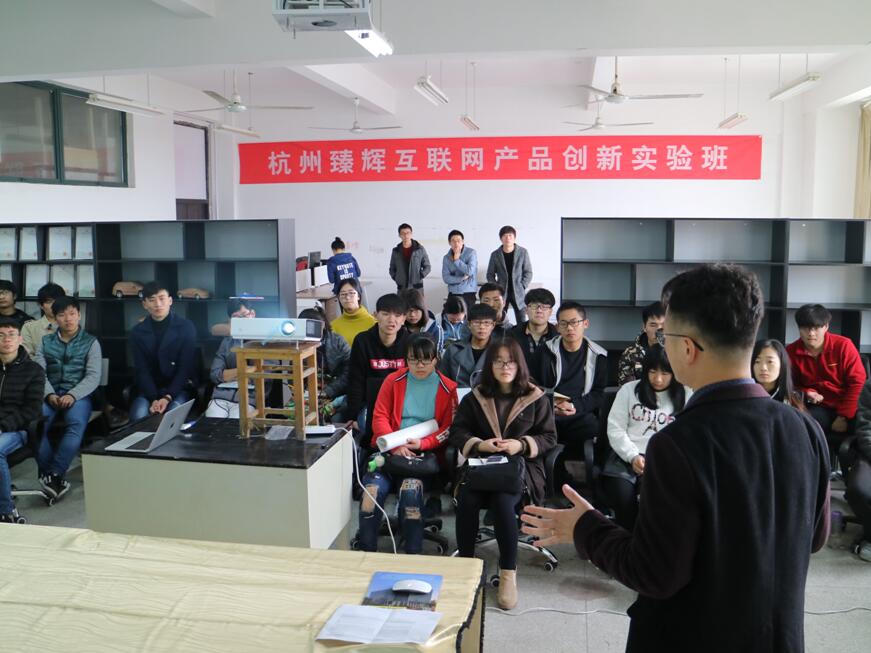 汪虎生首先从交互设计的概念定义入手,通过举例说明指出交互设计是人与人、人与物以及人与环境的交流、互动。然后通过介绍互联网产品交互设计的起源发展、交互设计设计什么、如何做好用户体验设计几个方面把交互设计这个大概念精简为用户行为过程设计。并且通过幽默风趣的语言,生动的产品案例介绍了用户体验设计的基本要素是易学易记、高效、纠错和用户满意度。而且,汪虎生还结合自身就业经历向同学们介绍了从事设计行业的发展前景,并鼓励同学们珍惜大学时光充实自己,尽快树立大学规划、就业规划。同时希望同学们能够带着自主学习、认真严谨、持之以恒的态度参加互联网产品创新实验班。在交流互动的环节,汪虎生和杭州臻辉科技有限公司技术团队的成员们也与现场同学展开一对一的交流讨论。