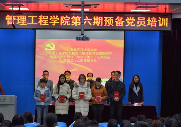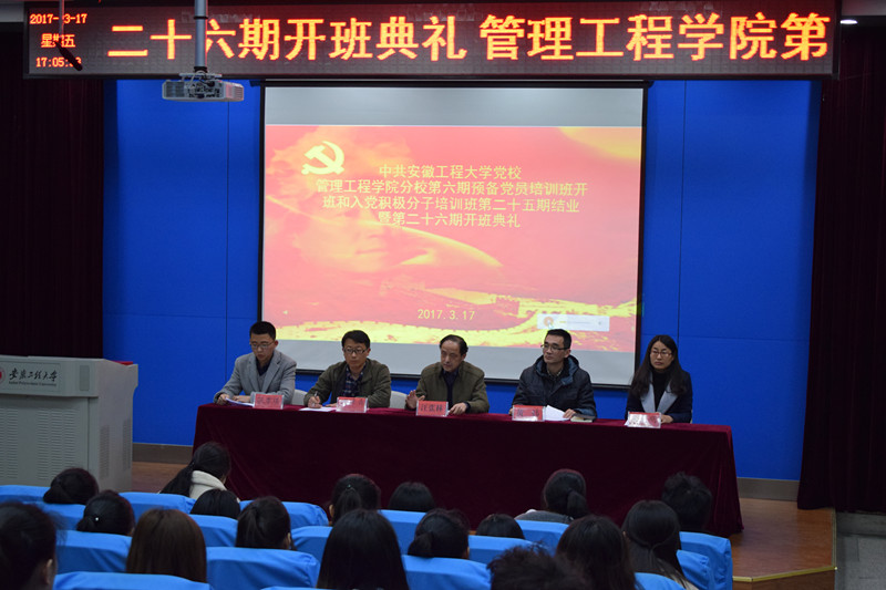 为进一步加强对学院预备党员和入党积极分子的培养与管理,根据学院2017年上半年党务工作安排,3月17日下午,管理工程学院在五教117录播室隆重举行分党校预备党员第六期培训班和入党积极分子第二十六期培训班开班典礼。院党委书记汪张林、院党委副书记黄炜、体育学院团委书记王彦青、院团委书记朱文明、全体学生党支部书记以及两期培训班学员参加开班典礼。典礼由入党积极分子第二十六期培训班班主任张孝琪主持。