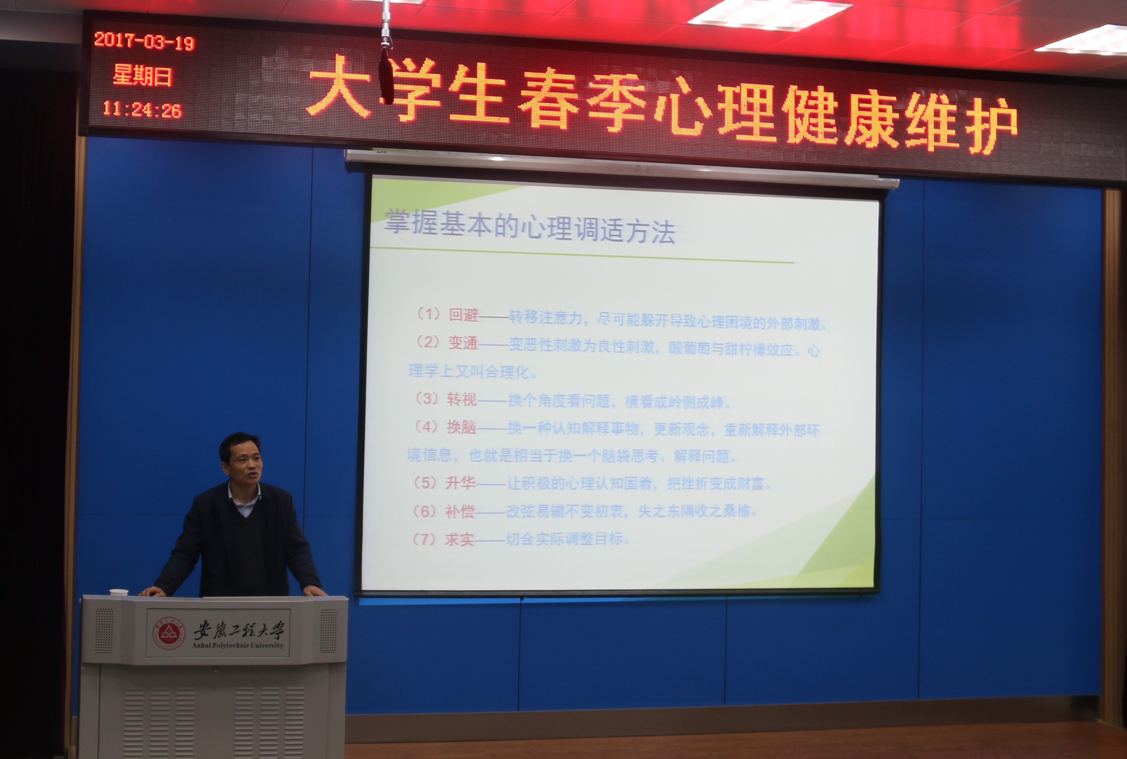 3月19日上午,我校在五教录播教室举办了主题为《大学生春季心理健康维护》的讲座,主讲人系我省大学生心理健康教育研究分会秘书长、安徽医科大学学生处处长马军成老师。尽管下着连绵小雨,但还是难以阻挡求学若渴的同学们的热情,现场暖意融融。