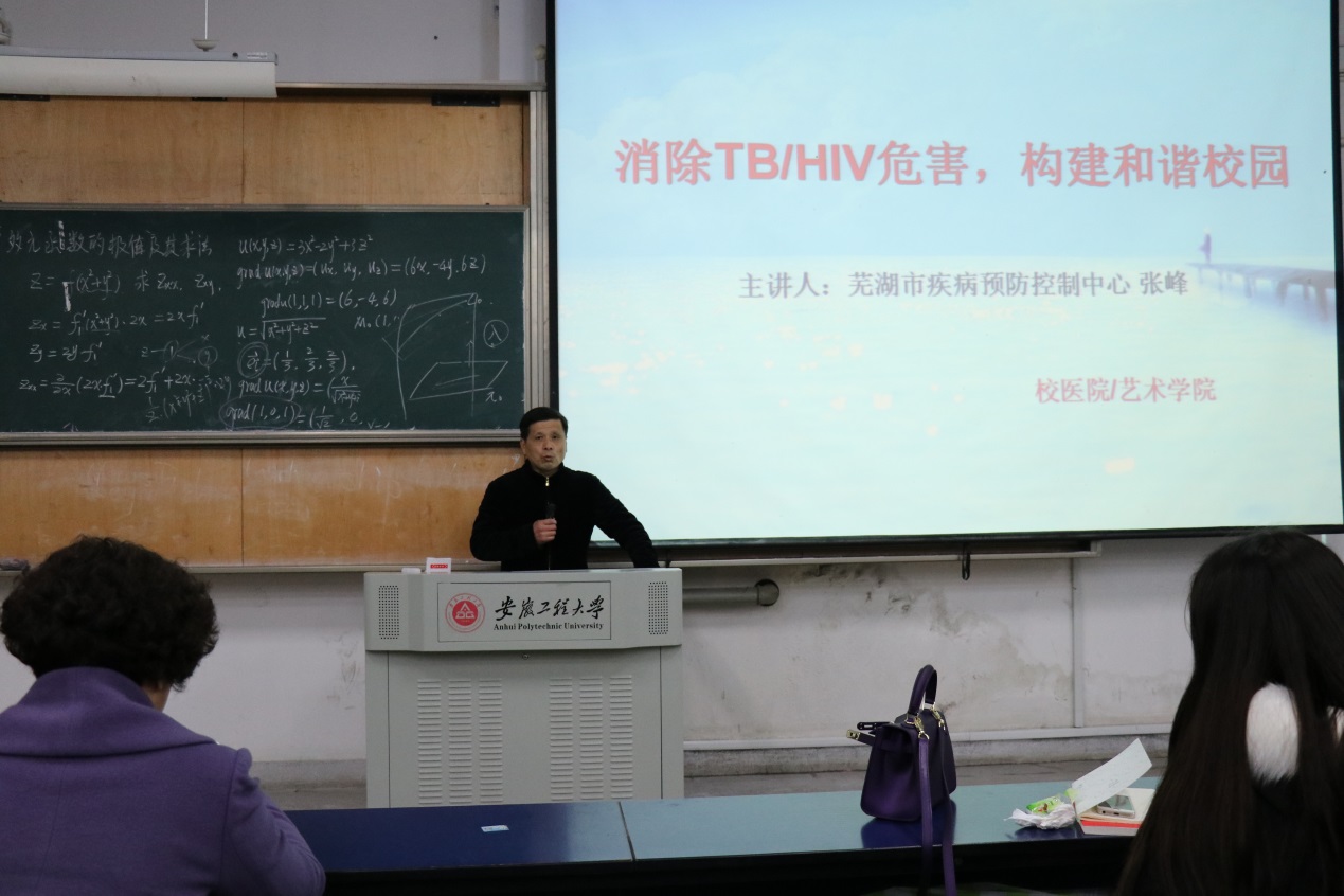 3月22日晚,艺术学院和校医院在6教215举办《消除TB/HIV危害 构建和谐校园》专题讲座,特邀安徽省防癌协会理事、芜湖市疾病预防控制中心结核病防治科科长张峰为主讲嘉宾。参与此次讲座的有校医院院长冼定昌、医生戴丽华,艺术学院辅导员鲍洁和部分学生,外国语学院“龙骨花”团队的志愿者等。