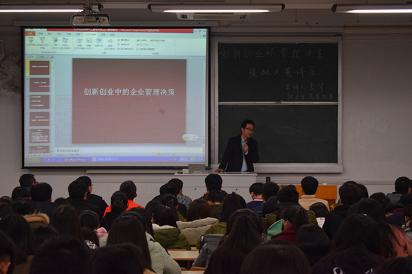 袁军首先与同学们探讨了“双创”背景下大学生如何创新、如何创业、如何成功创业,并从身边的具体事例讲述大学生创新创业所应具备的关键素质。随后,他详细介绍了“创新创业杯全国管理决策模拟大赛”赛事由来、规模、特点,在与现场同学们的互动中,为同学们介绍了竞赛的具体环节,从组建团队,了解公司历史到明确各项决策,确定未来5至10年公司战略等步骤,向同学们阐述如何在比赛中取得进步、取得好成绩。最后,他强调在比赛中要勤奋、要坚持、要有清晰的战略,并鼓励同学们积极参加管理模拟决策大赛。