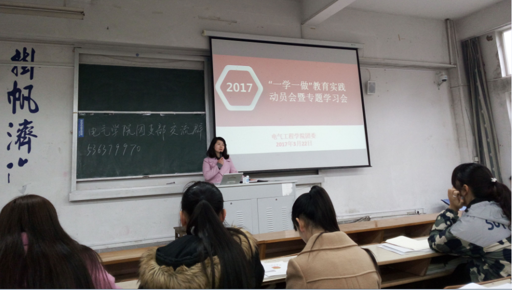 为积极响应共青团中央在全体共青团员中开展“学习习近平总书记重要讲话做合格共青团员”教育实践,深化并扎实推进“一学一做”学习教育,3月22日下午,电气工程学院团委在2教106教室召开“一学一做”教育实践动员暨专题学习会。院党委副书记郭全根、院团委副书记毕亚琴、院团委委员、各团支部支委会成员近200人参加了动员学习会。会议由毕亚琴主持。