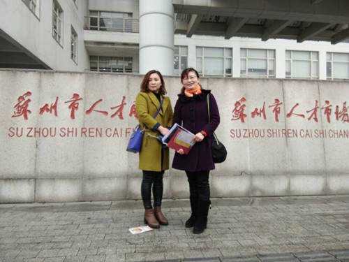 金艾裙与王艳芝先后走访苏州市人才市场、苏州市社会工作者协会、苏州市工业园区人力资源市场。与多家机构及企业进行了会谈,并就毕业生就业需求、就业创业政策以及发展前景交换了意见。在苏州市社会工作者协会的安排下,金艾裙一行参观了苏州几家社工机构,重点了解了苏州社工的社区工作完善程度、社区服务社会化状况、服务项目采购监督机制以及社工福利待遇等,并就进一步合作交流进行探讨。